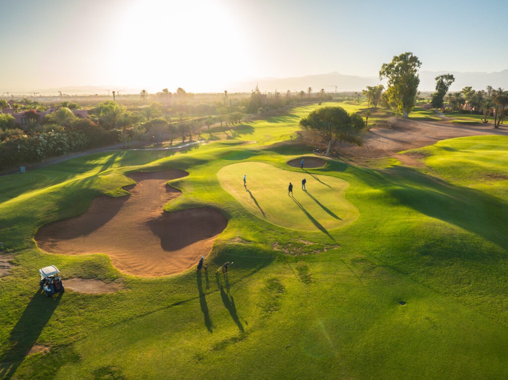 Der Amelkis Golf Club wirkt auf den ersten Blick klassischer als viele andere Plätze rund um Marrakesch. Palmen, Wasserhindernisse und gepflegte Fairways erzeugen eine parkähnliche Atmosphäre, die vertraut erscheint – und dennoch eigenständig bleibt.